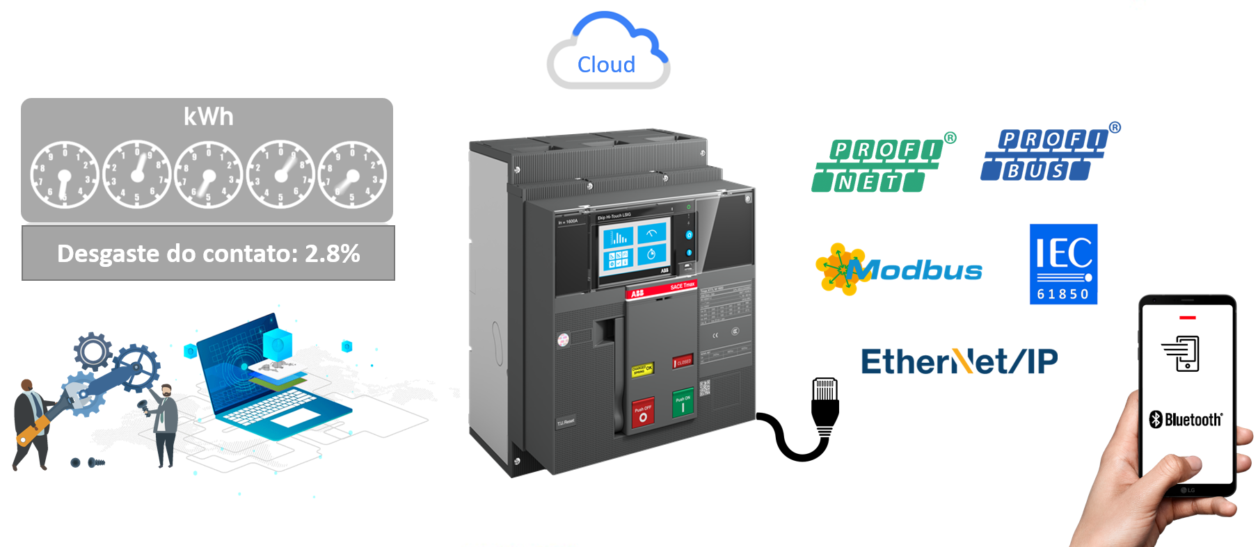 Os disjuntores da ABB vão muito além da função tradicional. Eles atuam também como dispositivos de medição e monitoramento contínuo da rede elétrica, coletando dados fundamentais para avaliar a qualidade da energia e o desempenho do sistema. Possuem ainda digitalização de todos os dados, permitem conectividade com nuvem, protocolos de comunicação industrial e também conexão com smartfone via bluetooth. Os modelos digitais e conectados da ABB, como os das linhas Emax 2 (caixa aberta) e Tmax XT (caixa moldada), possuem sensores e módulos eletrônicos capazes de medir, em tempo real: