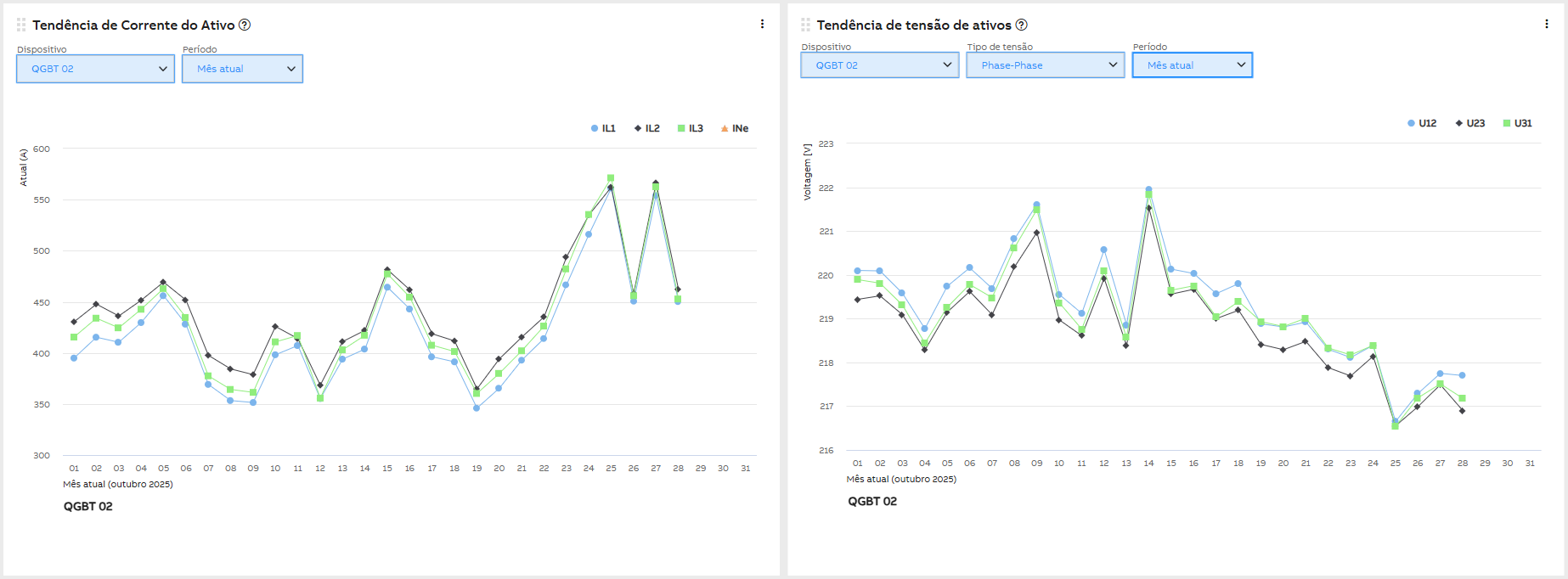 Tensão (V) – em cada fase e entre fases, permitindo detectar quedas, surtos ou desequilíbrios;
